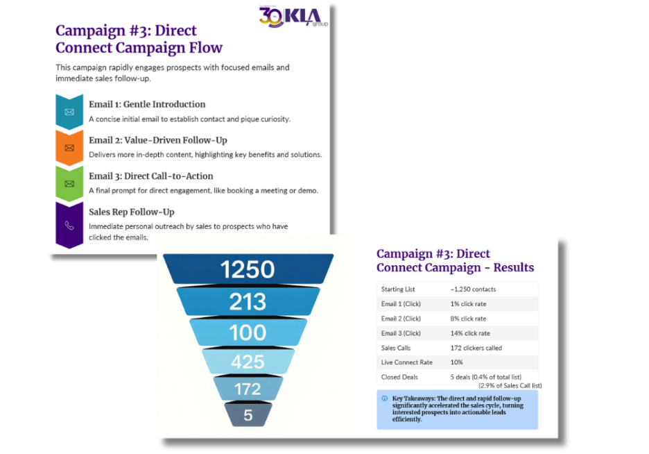 The Direct Connect Campaign is another that KLA Group designed and ran for clients with what we call “warmer cold lists”—names they had gathered from events, referrals, or previous interactions but had not yet converted. It’s built for speed and direct results, making it one of the most effective outbound sales campaigns we deliver.