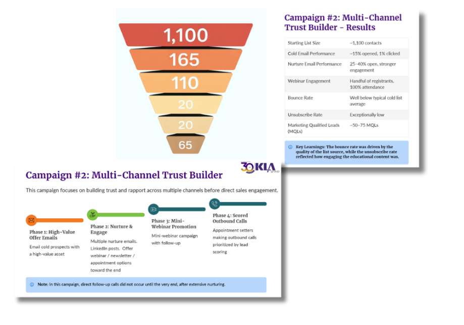 The Multi-Channel Trust Builder builds the most trust. KLA Group’s campaigns use email, LinkedIn, and webinars to build credibility before asking for a meeting. It’s a highly effective B2B lead generation approach.